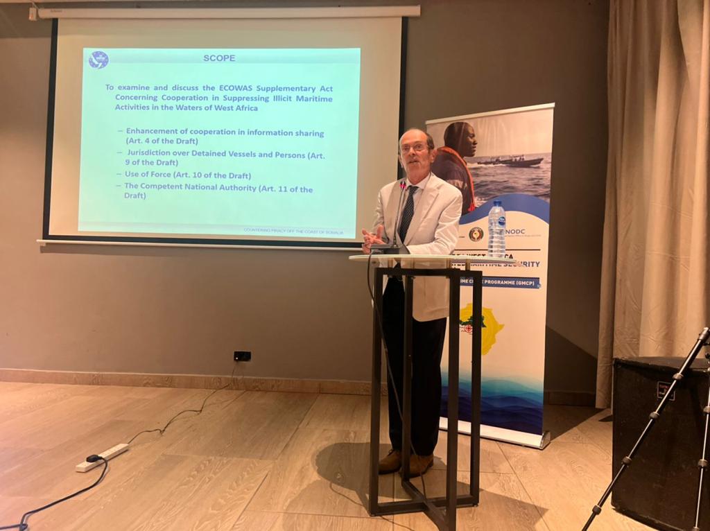 The draft is an overarching effort to tackle illicit maritime activities such as drug trafficking, human trafficking and weapons smuggling through law enforcement cooperation and combined operations between ECOWAS Member States. MAJ Lorenzo provided the attendees with an insight into the legal issues related to Maritime Interdiction Operations (MIO) from the perspective of Operation Atalanta's experience in East Africa. The matters discussed ranged from using force and rules of engagement in MIOs to jurisdictional issues, boarding of suspect vessel procedures and exchanging information.
